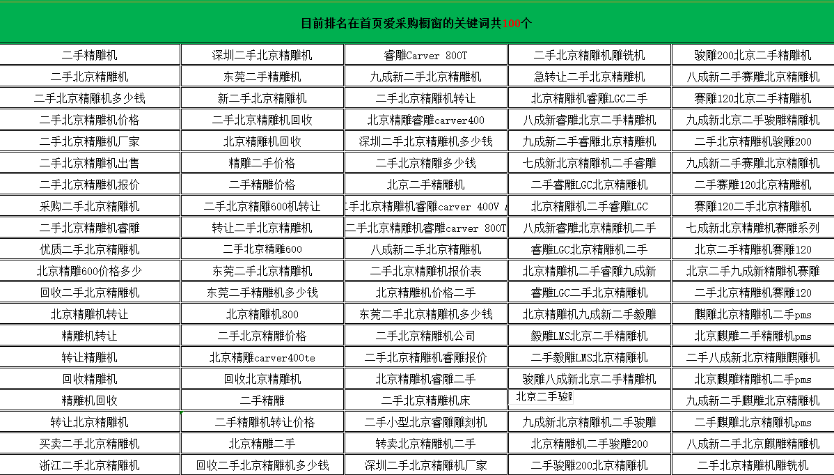 在接手哈挺爱采购项目前,对于哈挺这家公司的产品、定位,以及与同行之间的优劣势进行了分析,首先东莞哈挺机械制造有限公司十年专做北京二手精雕机的销售、维修、回收、租赁,业界口碑良好。公司定位是为客户提供二手北京精雕机销售、安装、售后一条龙服务。资历口碑与优质的服务是哈挺与同行之间最大的差异优势。抓住这几点优势,快速获取到用户的咨询。