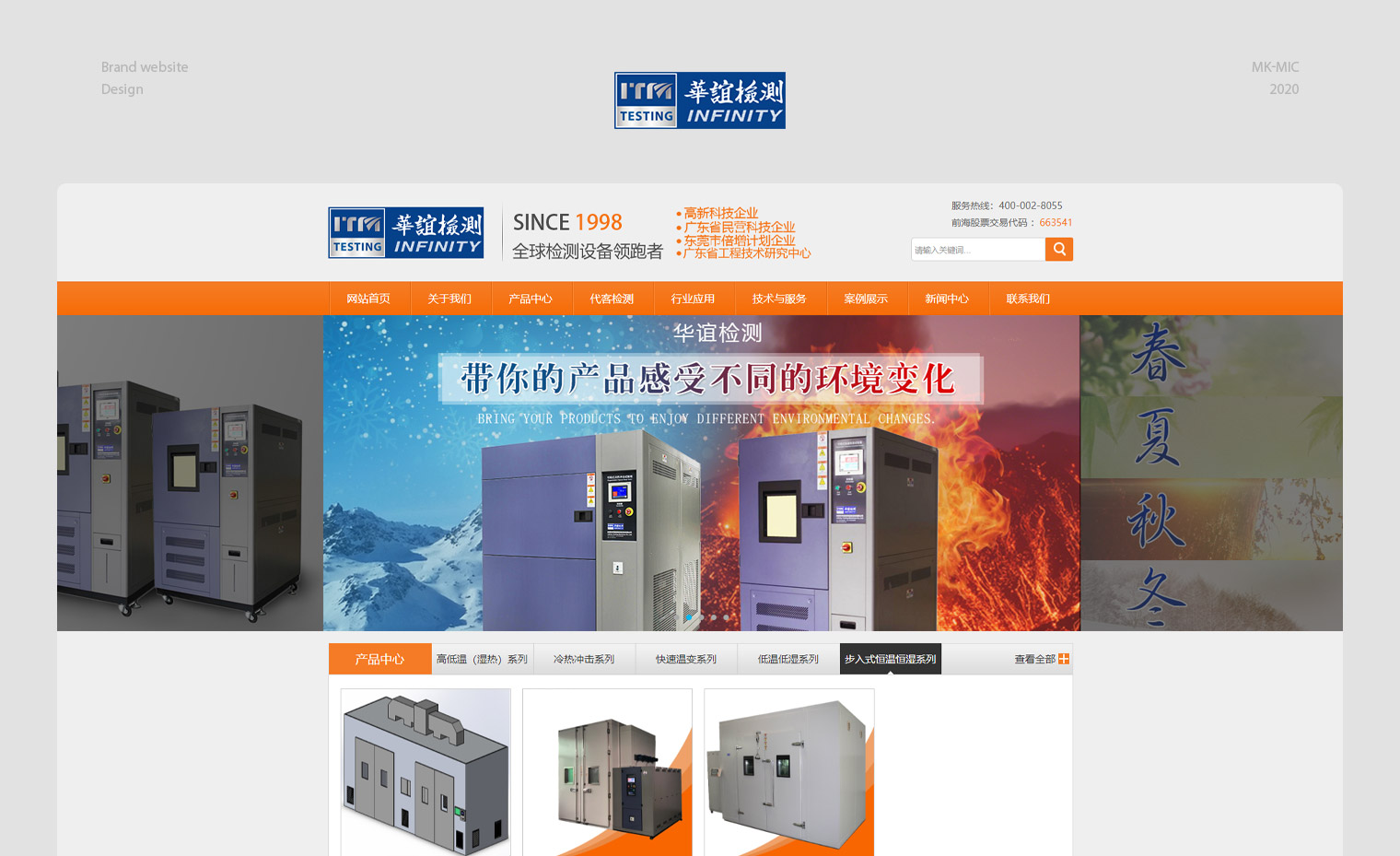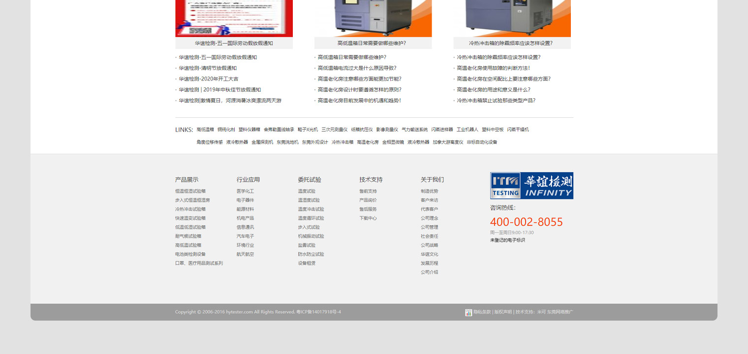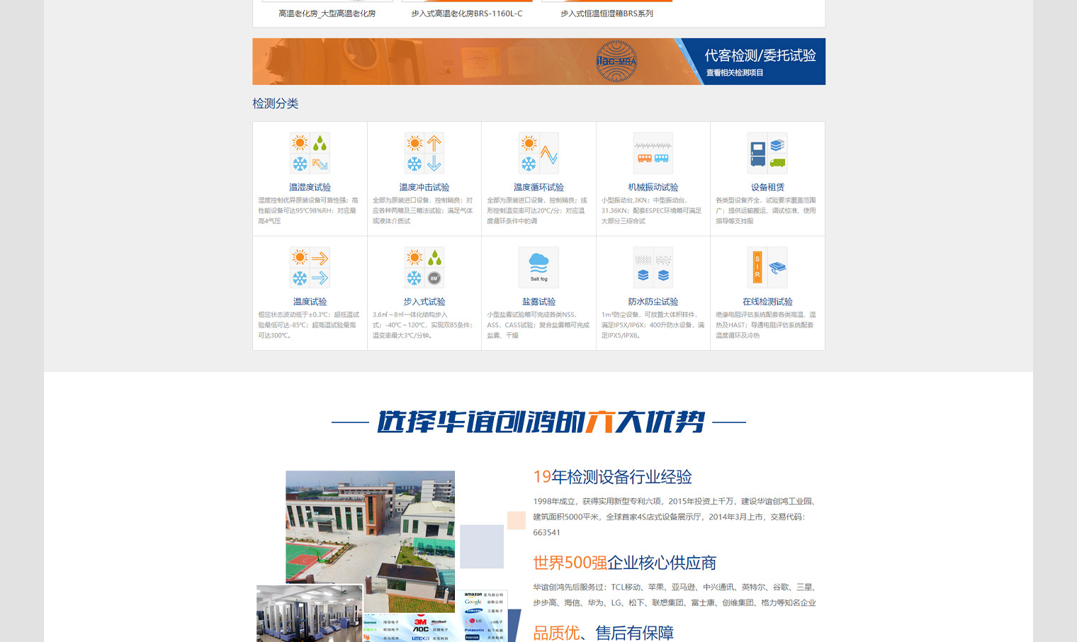 华谊检测交易代码:663541,集研发、生产、销售于一体,高低温箱、高温老化房、冷热冲击箱、恒温恒湿试验箱,网站建设以营销推广为主,结合华谊检测行业定位:营销、品牌、质量三大需求,网站设计上要突出公司品牌形像,又要解决营销问题,通过网络获取客户询盘,网站内容布局解决了客户需求问题。
