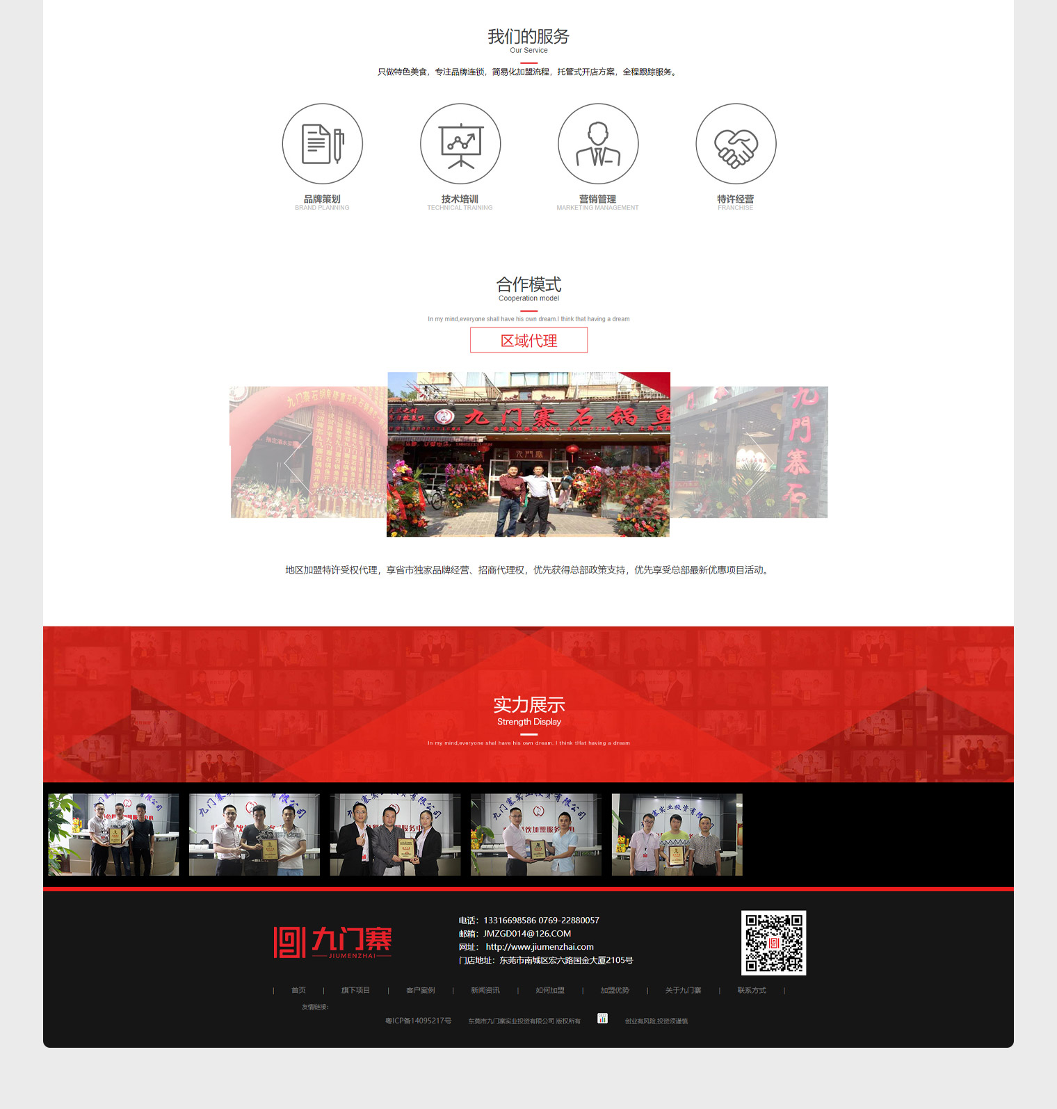 九门寨餐饮,是中国可靠的特色餐饮创业服务平台,专注中高、中低端餐饮行业发展,提供整套的餐饮连锁开店解决方案,从选址到装修到技术培训再到营销管理,资深团队帮助加盟伙伴轻松创业。我们根据客户的业务方向,为客户定制了热门项目,品牌优势,合作案例等展示,让用户充分了解品牌的优势。合作的展示增加客户在网络上的竞争力。