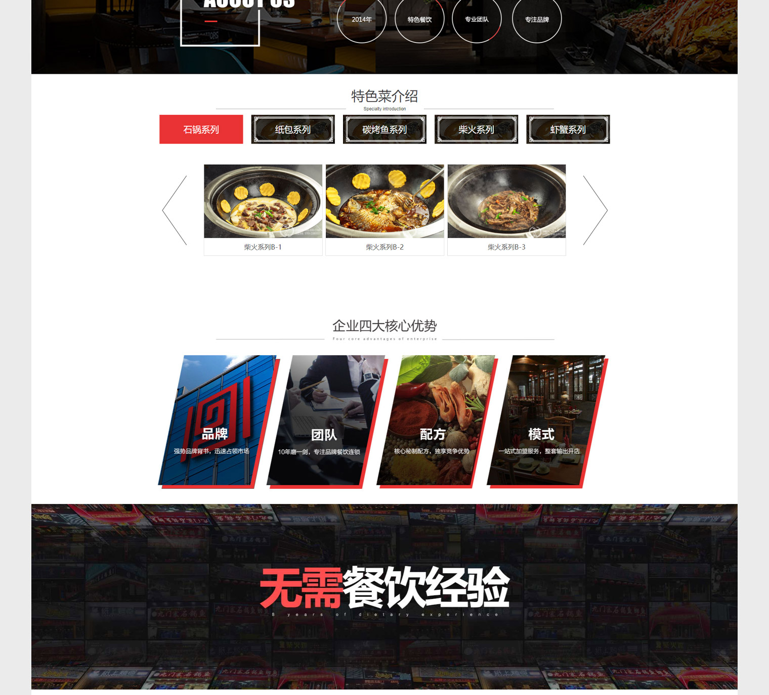 九门寨知名餐饮品牌,网站建设主要用于营销推广加商加盟为主,九门寨餐饮全部都是以鱼类为主,在页面设计上针对各种类型做了独立页面设计突出特色,石锅鱼_酸菜鱼_纸包鱼_锡纸小烤鱼等,每个都有独立的特色介绍,推广过程中不同关键词采用不同的落地页,用户进来看到的就是想要了解的信息。