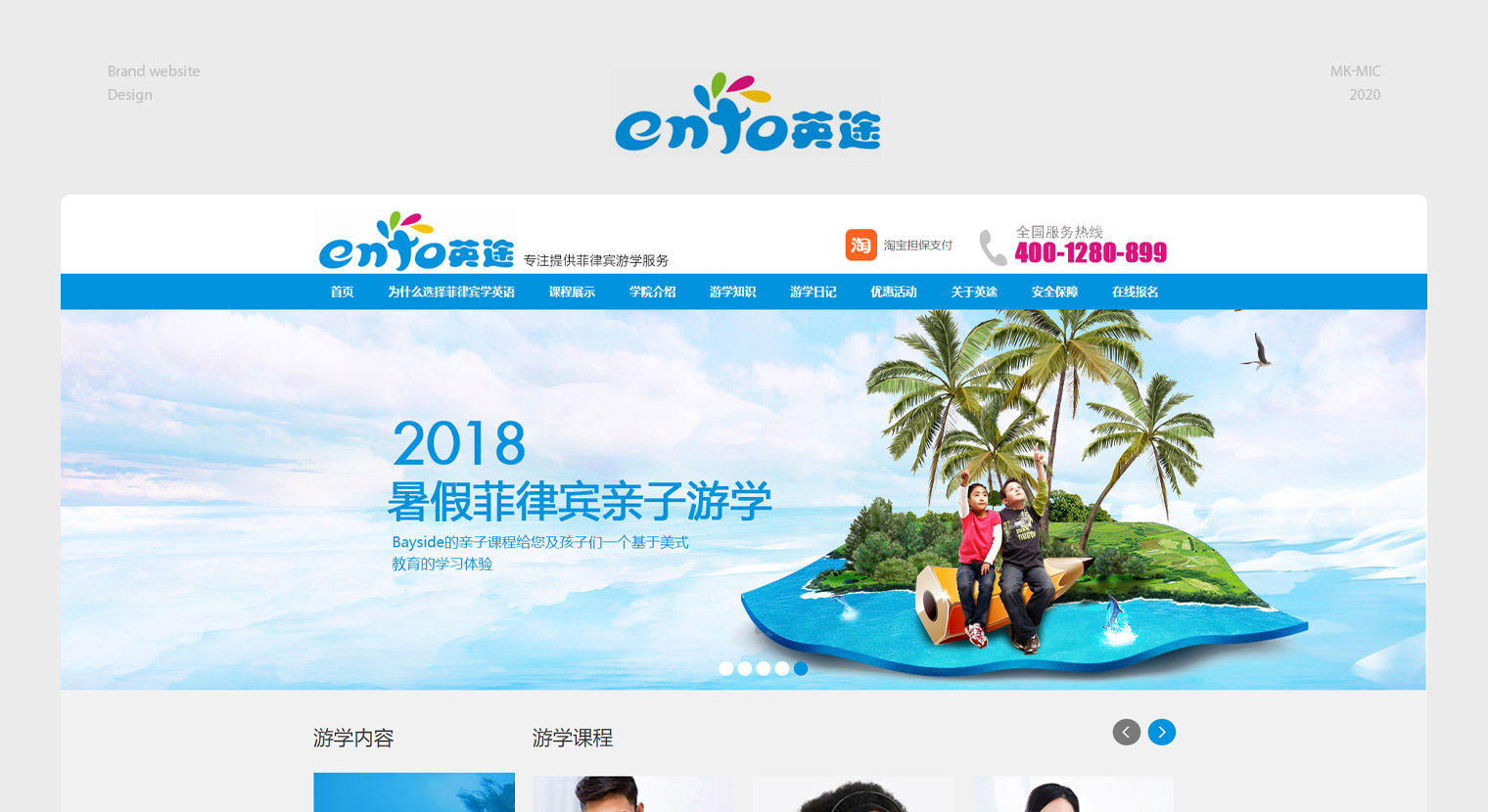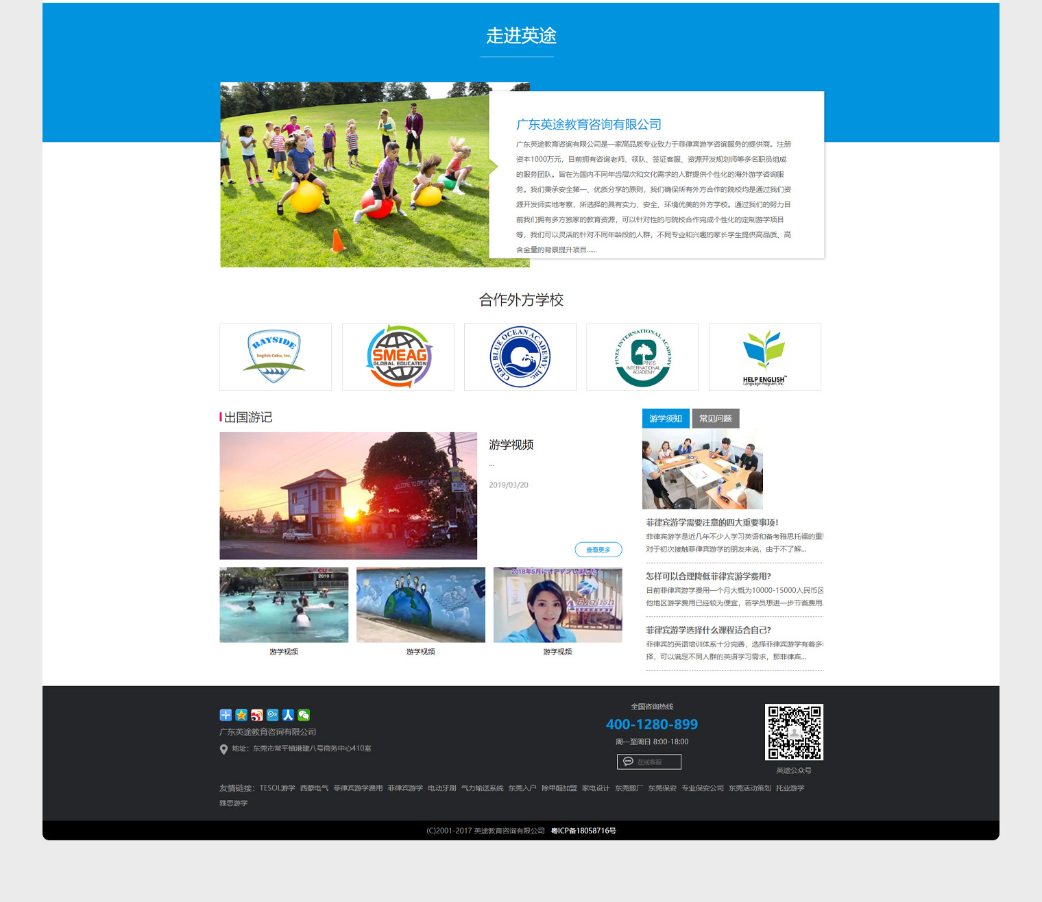 英途网站设计结合行业特性使用浅色调,内容布局以课程,学校,公司优势,游学的好处为主,内容更多的是在传递游学对于子女教育的影响,通过体验国外的生活。