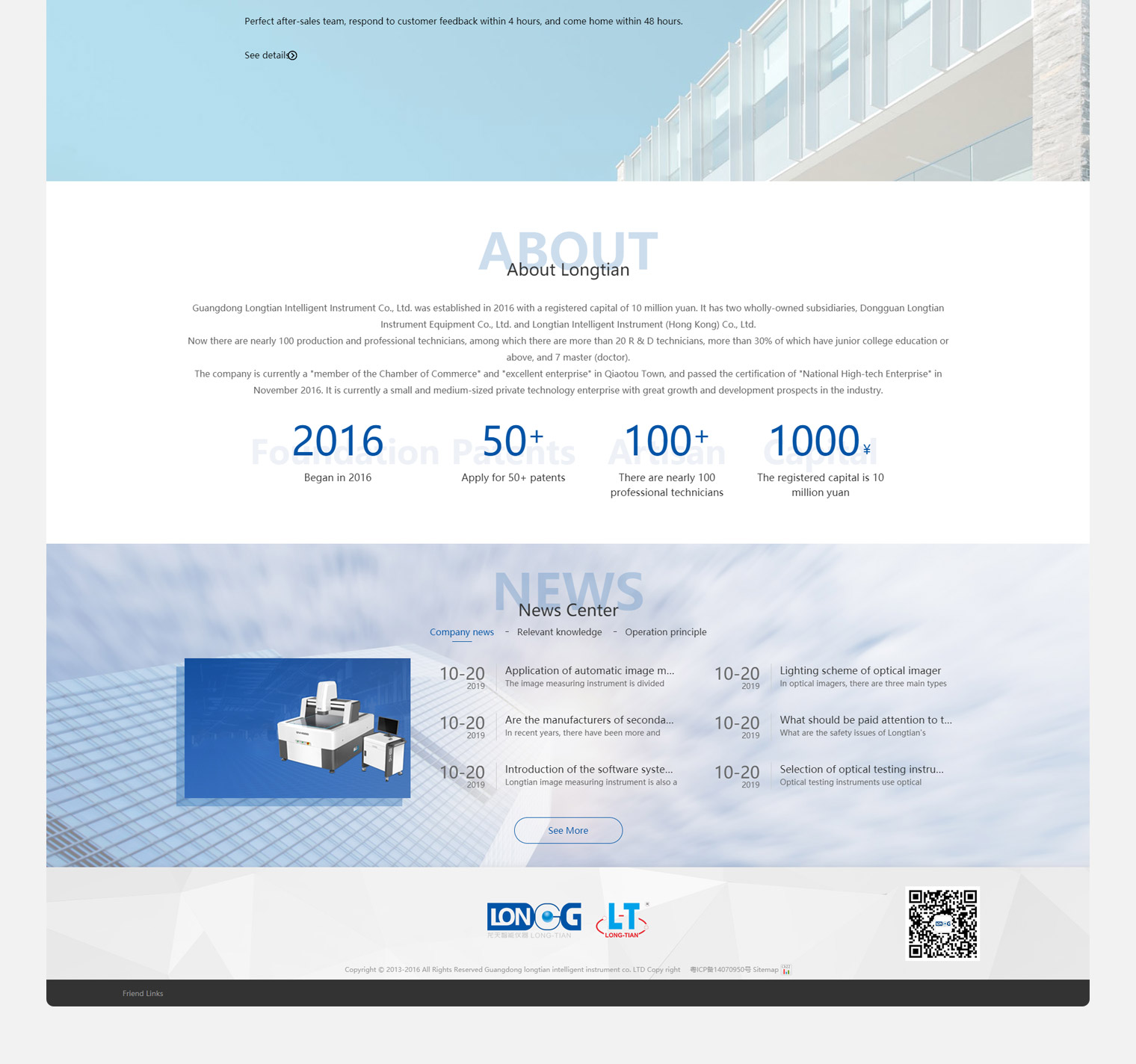 广东龙天智能仪器股份有限公司成立于2016年,注册资金1000万元,下设东莞市龙天仪器设备有限公司、龙天智能仪器(香港)有限公司二家全资子公司。公司总部位于享有"中国荷花名镇"、"广东省技术创新专业镇"、"广东省中心镇"之誉的东莞市桥头镇,现有生产及专业技术人员近100人,其中研发技术人员20余人,大专以上文化程度占30%以上,硕(博)士7人。公司现为桥头镇"商会理事单位"、"优秀企业",并于2016年11月通过"国家高新技术企业"认证,是目前行业极具成长和发展前景的中小民营科技企业。
